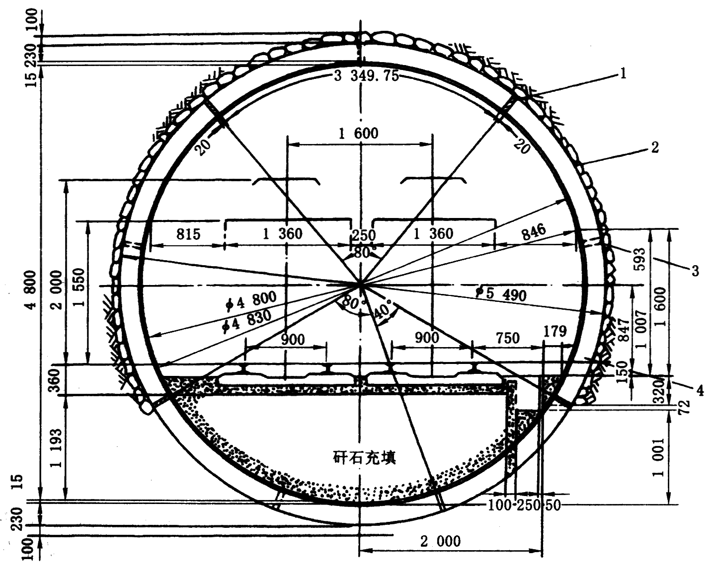 3—吊装孔、注浆预留孔;4—C100高强钢筋混凝土弧板,4.5块/圈,弧板规格3349.75mm×320mm×230mm,650kg/块