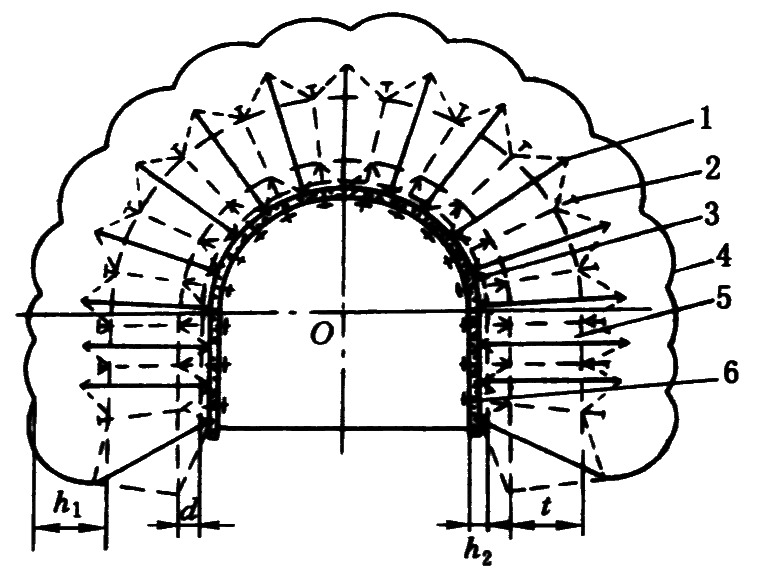 5—锚杆作用形成的岩石拱(d);6—喷层作用形成的组合拱(h2)