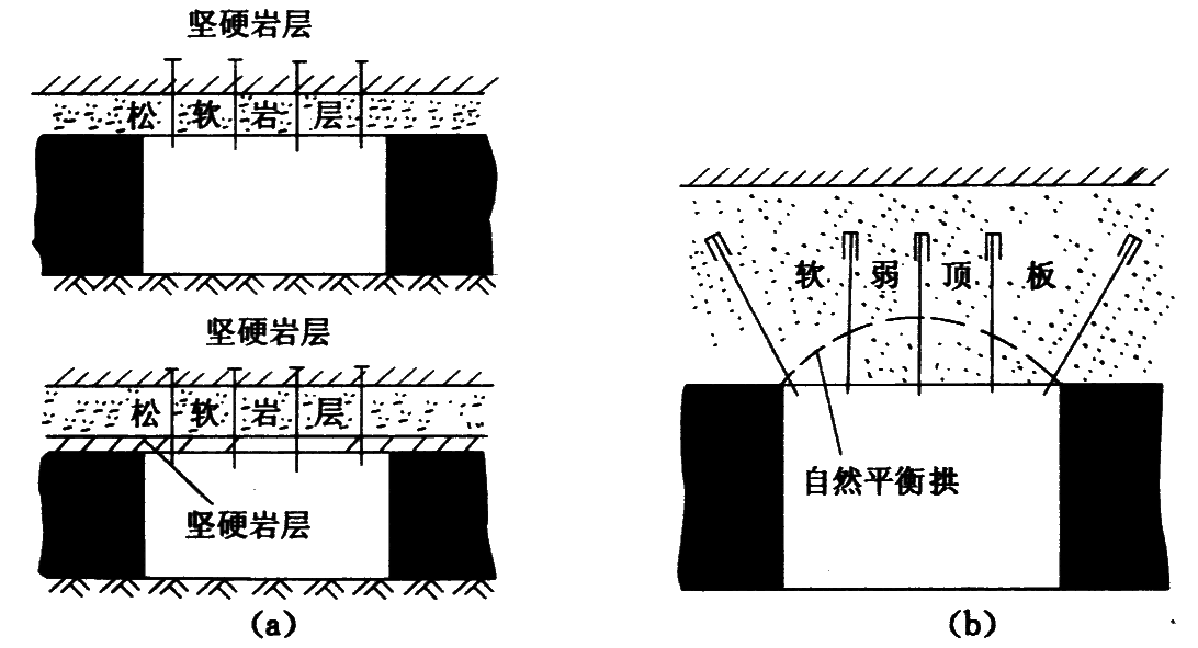 (a) 顶板有坚硬稳定岩层时锚杆的悬吊作用;(b) 围岩中有自然平衡拱时锚杆的悬吊作用