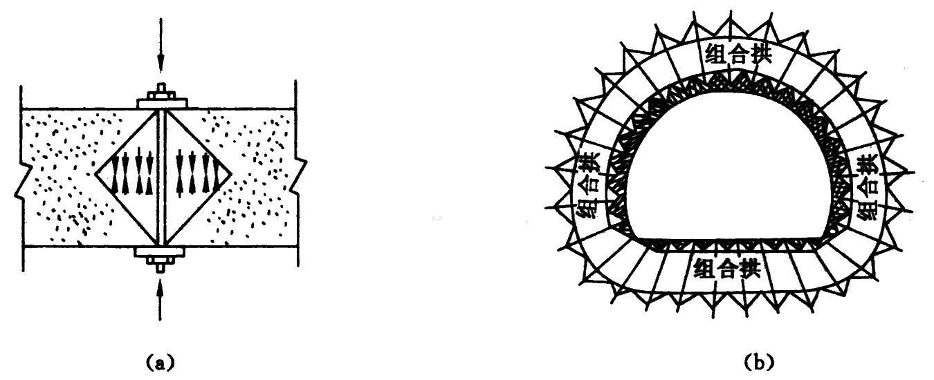 (a) 单体锚杆对破裂岩石的控制;(b) 锚杆群的挤压加固拱