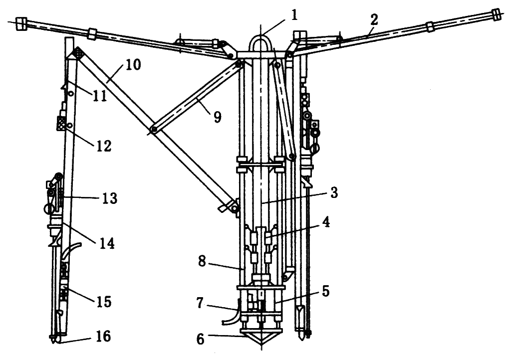 13—起爆电缆;14—中心回转抓岩机;15,16—混凝土输送管