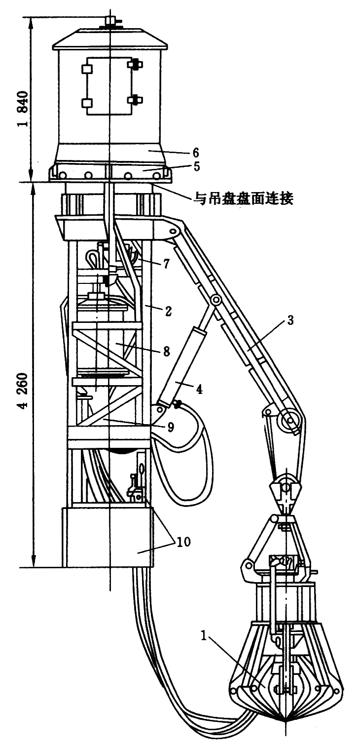 1—抓斗;2—机架;3—壁杆;4—变幅油缸;5—回转机构;6—提升绞车;