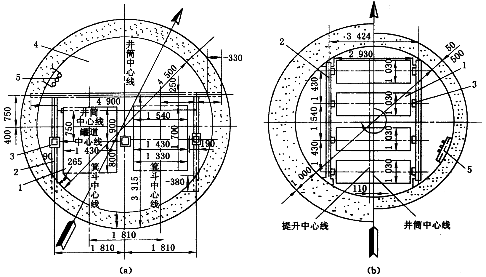 1—箕斗;2—罐梁或悬臂支座;3—罐道;4—梯子间;5—管路电缆间;6—电缆架
