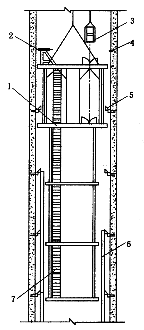 1—井壁;2—井圈背板;3—模板;4—吊盘;5—混凝土输送管;6—吊桶