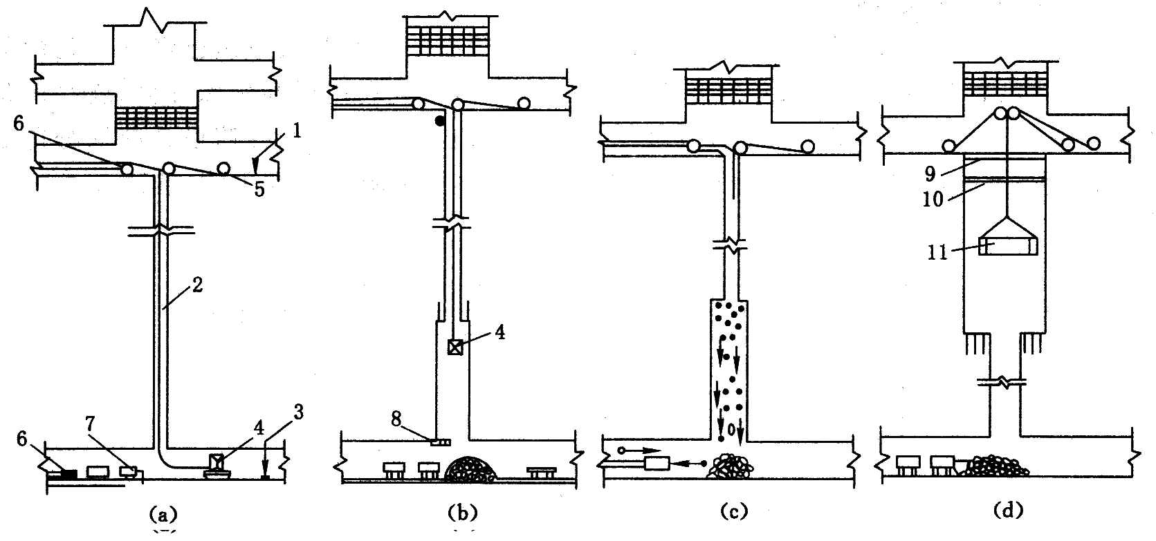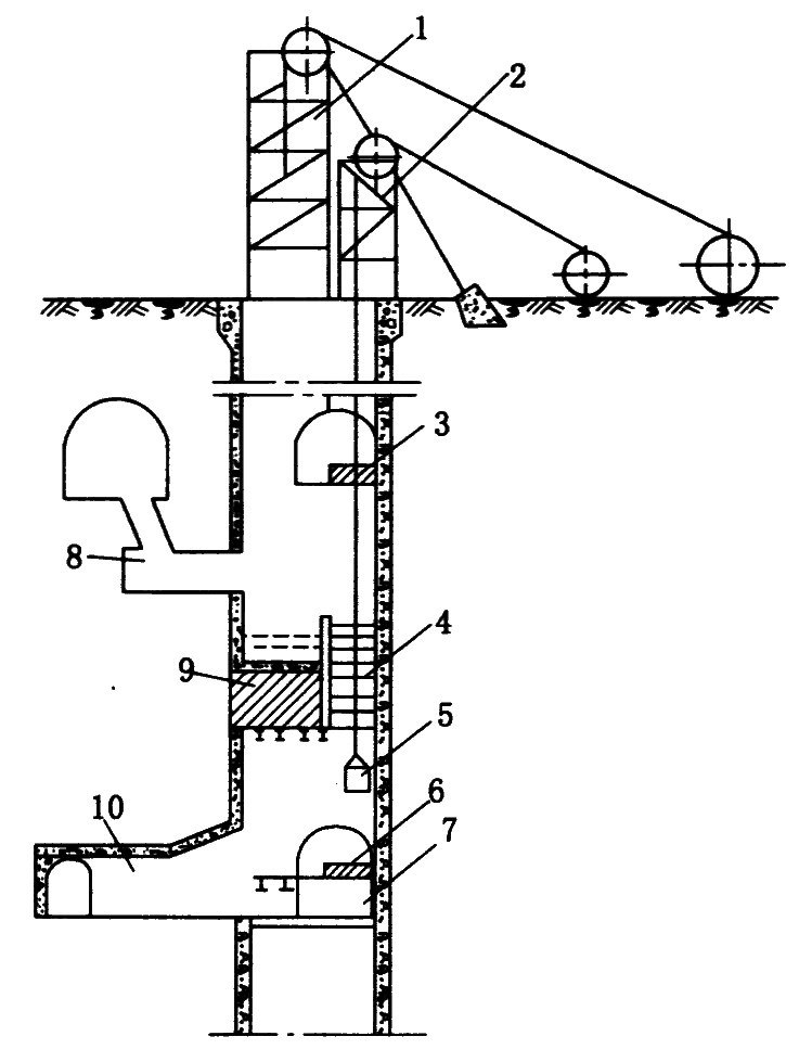6—井下卸矸石;7—出矸绕道;8—箕斗装载硐室;9—保护设施;10—凿井绞车硐室