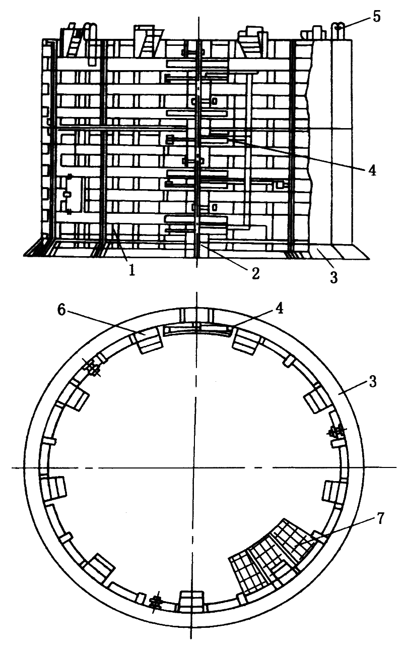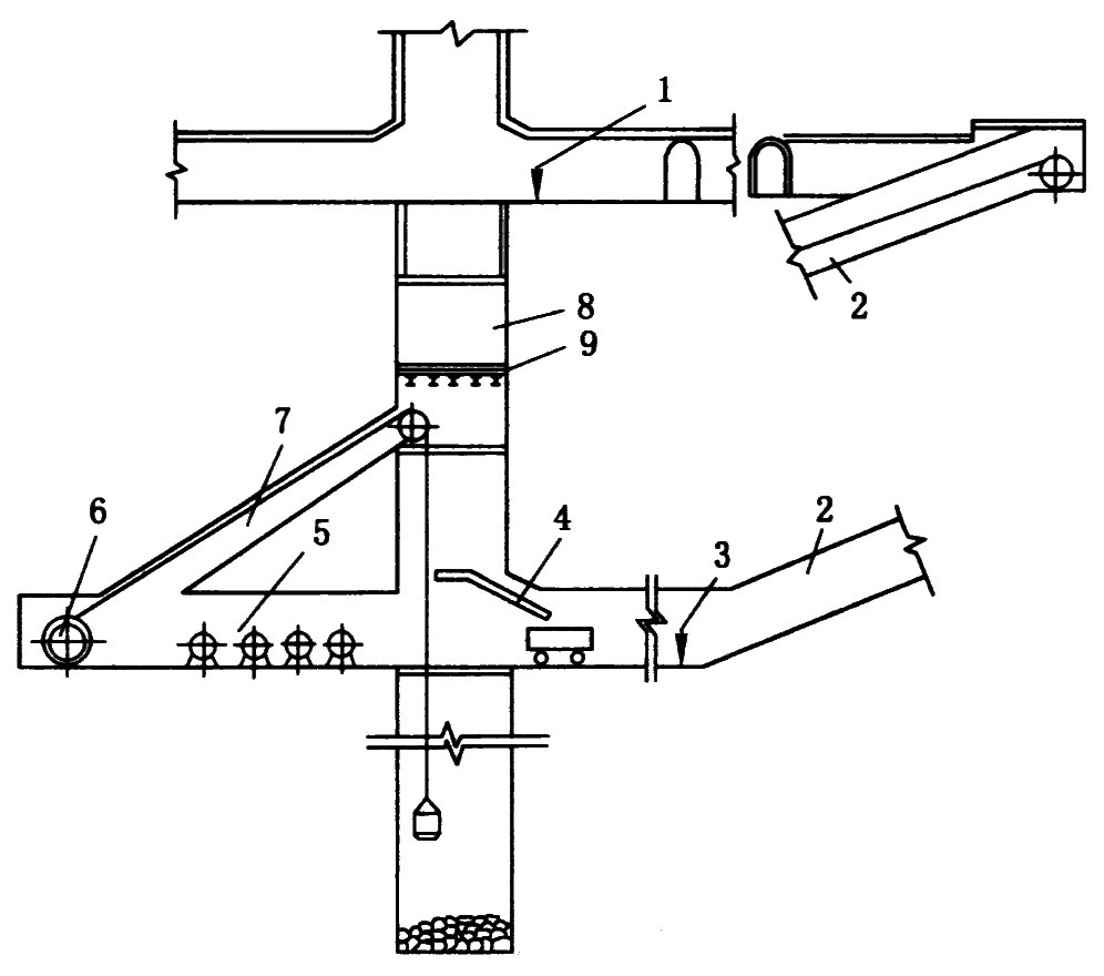 1—副井马头门;2—煤仓;3—箕斗装载硐室;4—井壁;5—壁座;6—主井接受仓;7—水窝