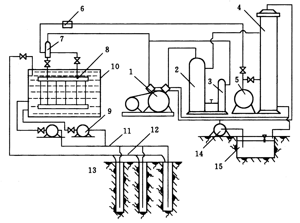 8—蒸发器;9—盐水泵;10—盐水箱;11—配液管;12—集液管;13—冻结孔;14—冷却水泵;15—冷却水池