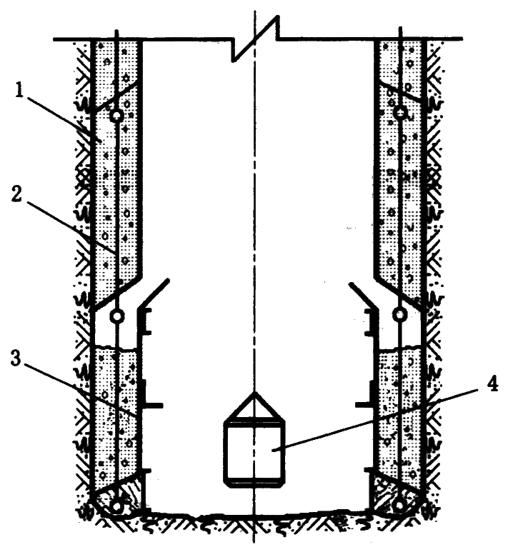 1—井壁;2—吊挂钢筋;3—模板;4—吊桶