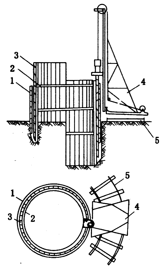 1—外导圈;2—内导圈;3—板桩;4—打桩机;5—轨道