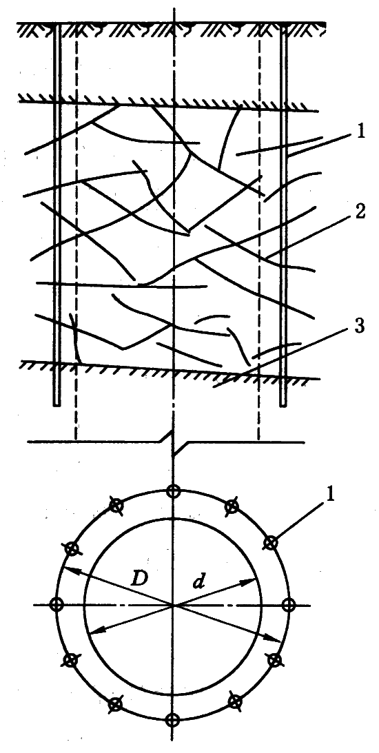 1—冰冻沟槽;2—配液管;3—冻结管;4—供液管;5—回液管;6—冻结圈