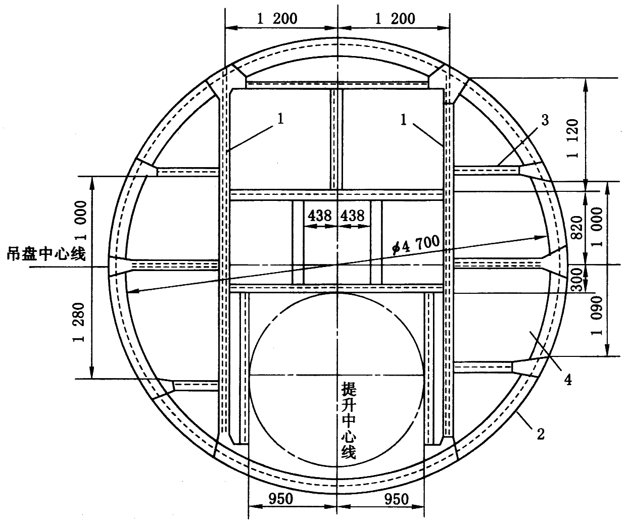 1—双层吊盘;2—罐梁;3—吊架;4—罐道