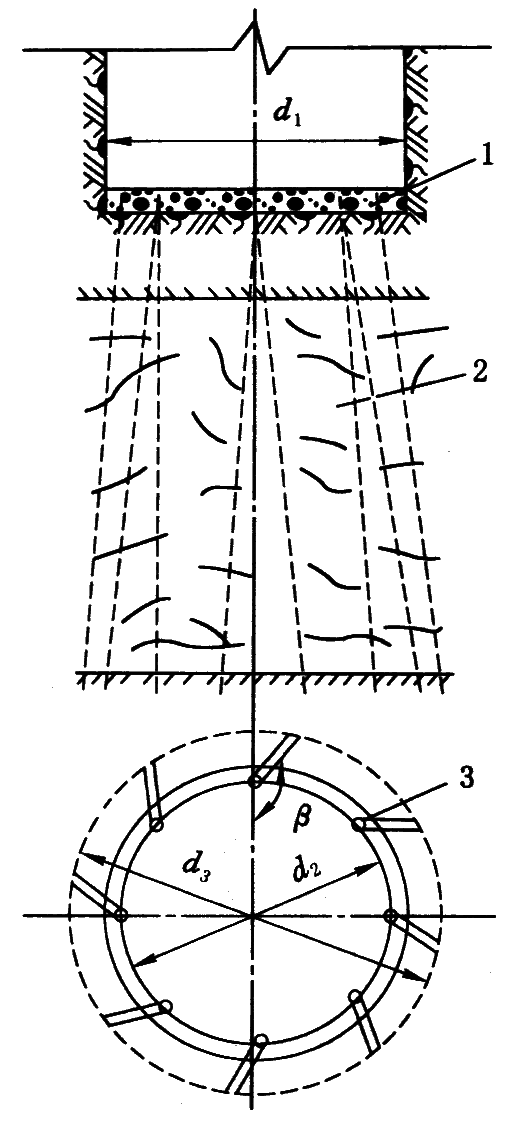 d1—掘进距离;d2—注浆孔布置直径;d3—孔底圈径;β—螺旋角(120°~180°)