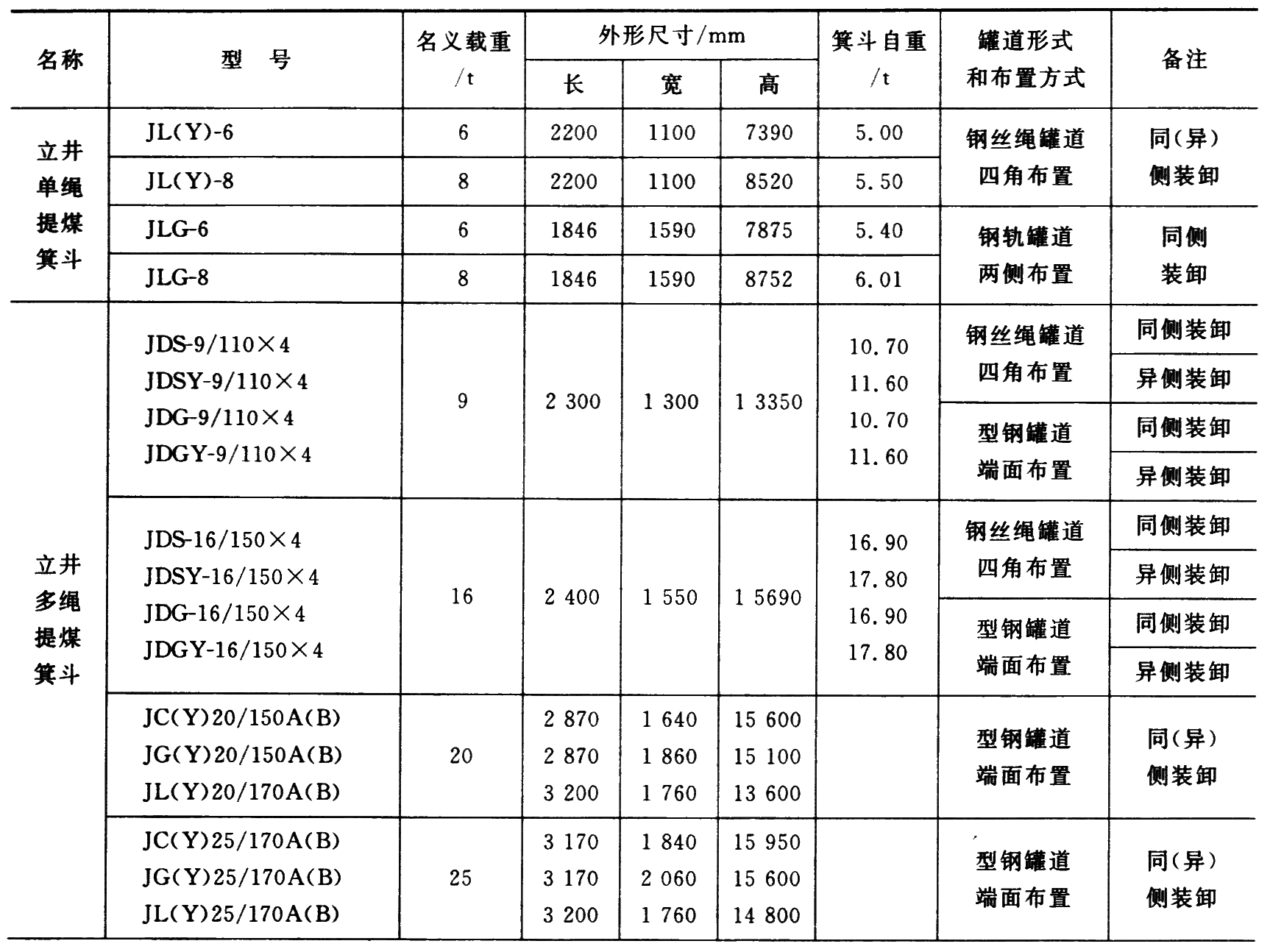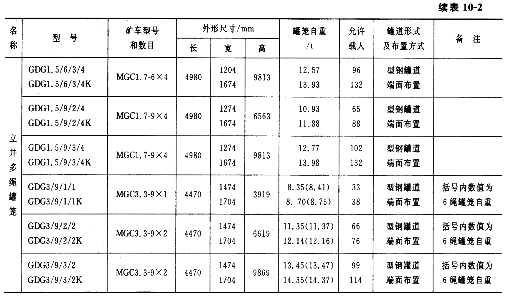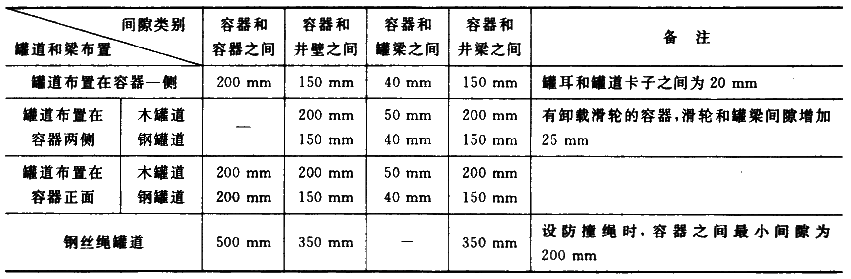 1—箕斗;2—罐笼;3—罐梁;4—托架;5—木罐道;6—钢轨罐道;