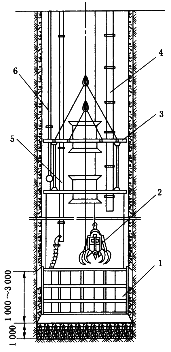 1—模板;2—抓岩机;3—吊盘;4—风筒;5—混凝土输送管;6—压风管