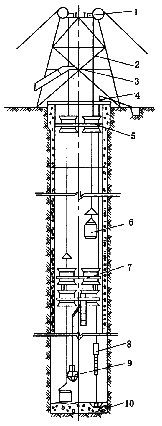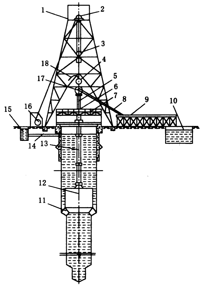 1—钻塔;2—天车;3—游车;4—水龙头;5—六方钻杆;6—转盘;7—钻台;8—排浆管;9—排浆溜槽;