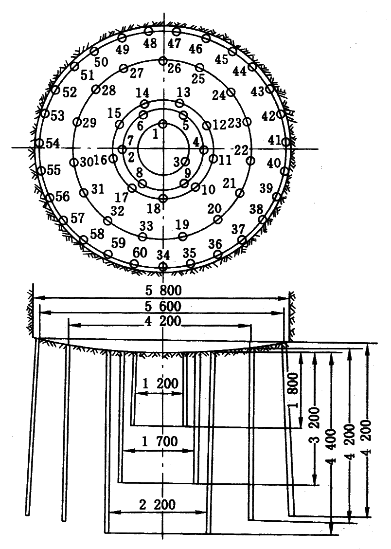 1—多层吊盘;2—钻锚杆眼;3—吊笼;4—安装锚杆;