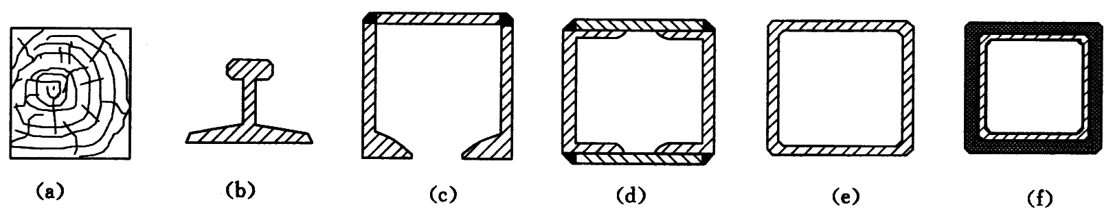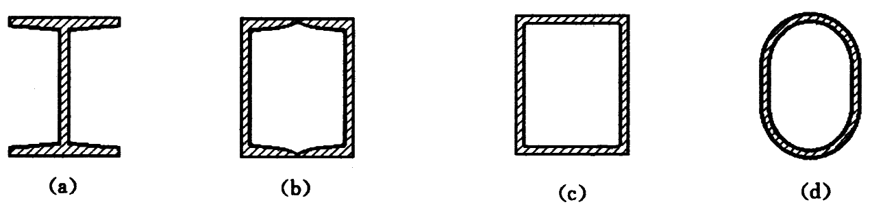 (a) 工字钢罐梁;(b) 槽钢组合罐梁;(c) 整体轧制罐梁;(d) 异形截面罐梁