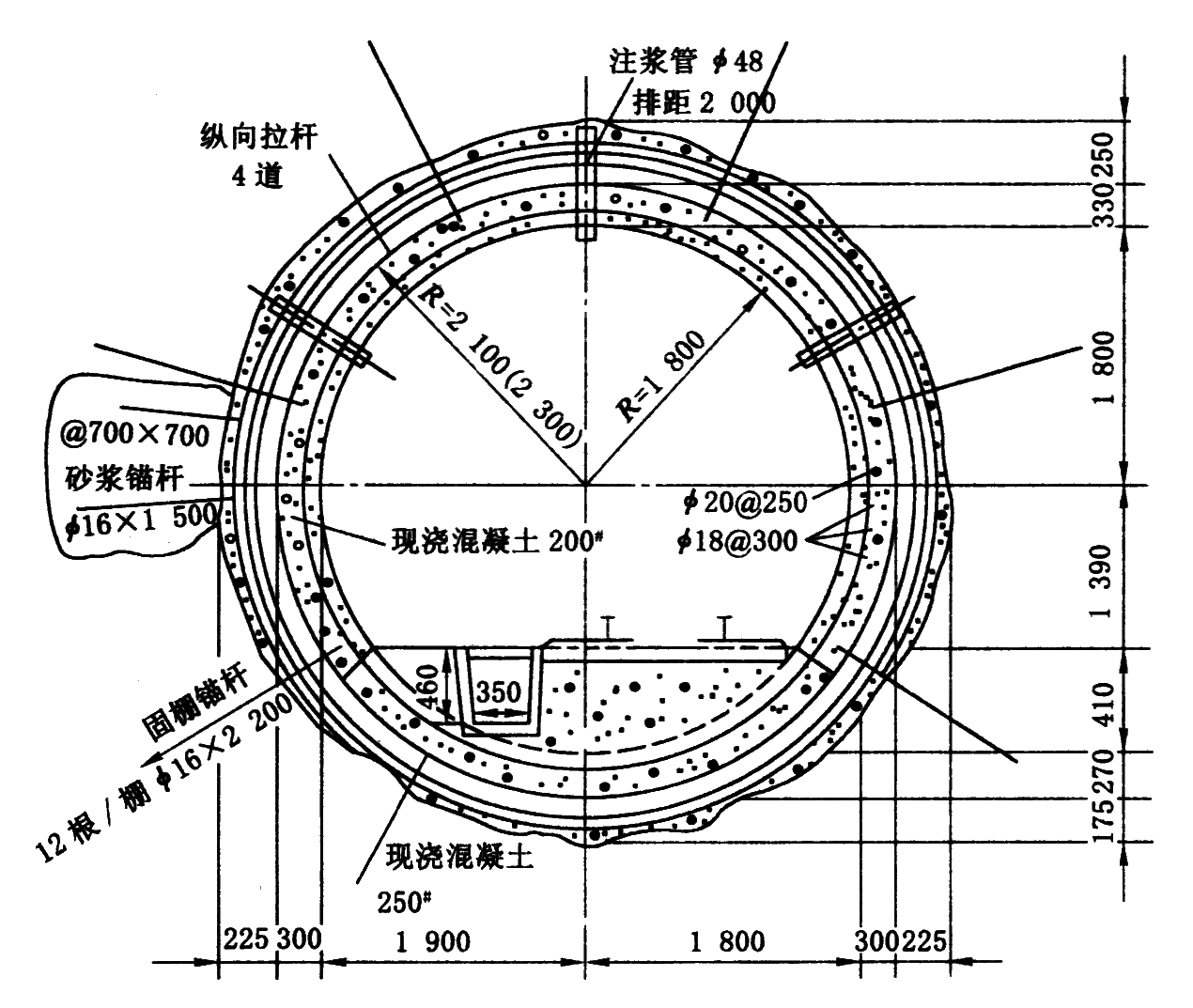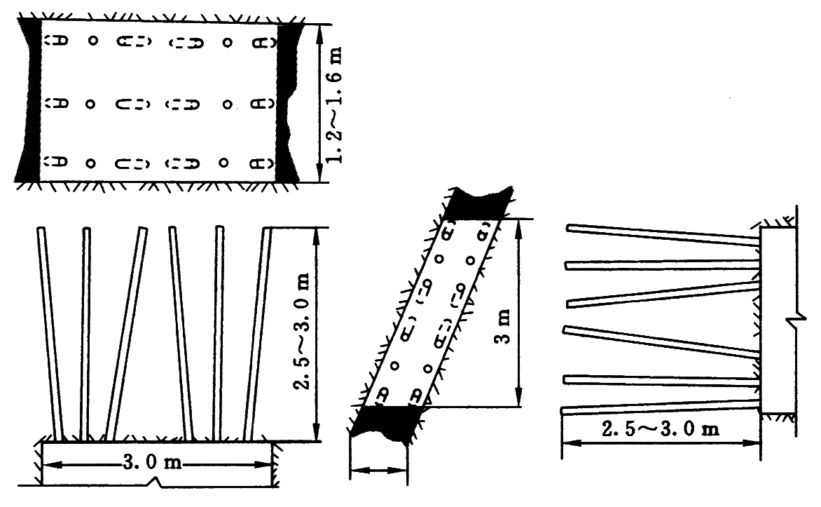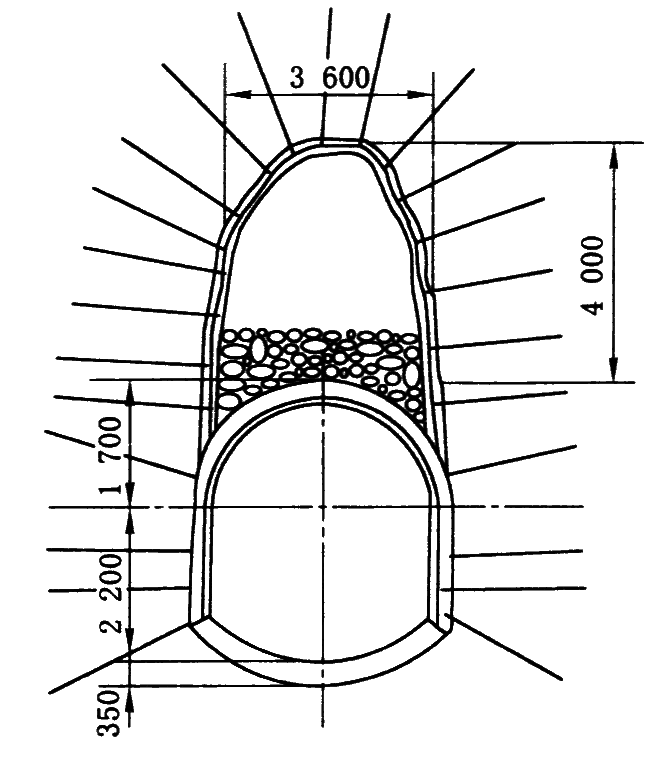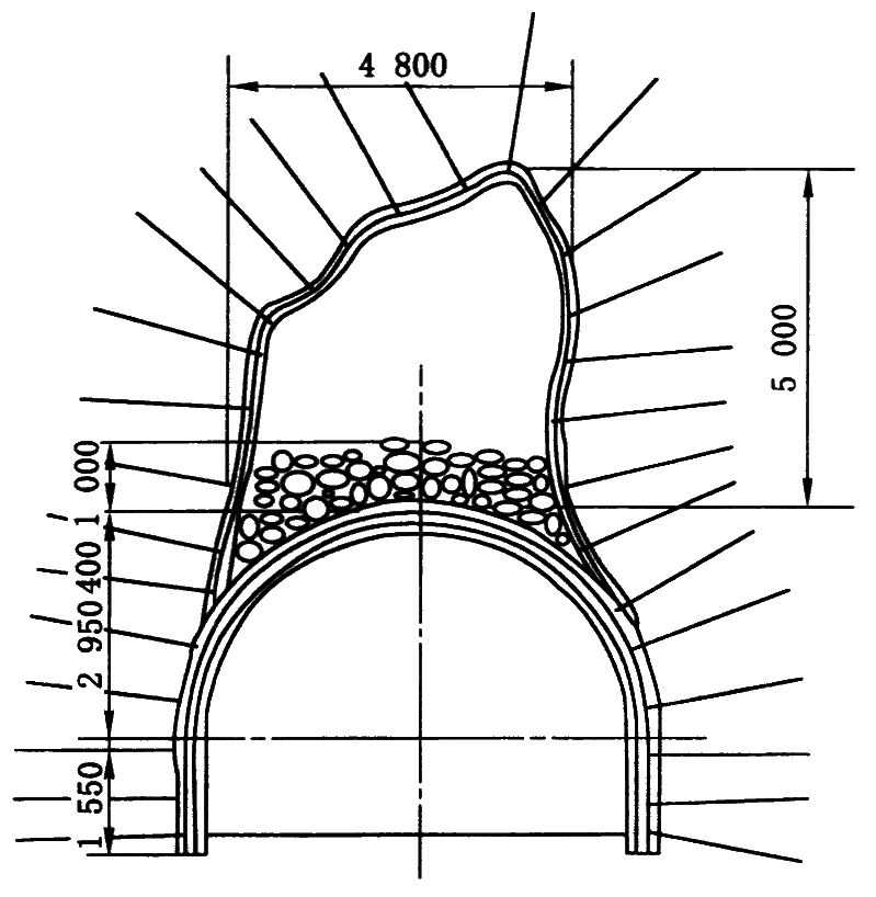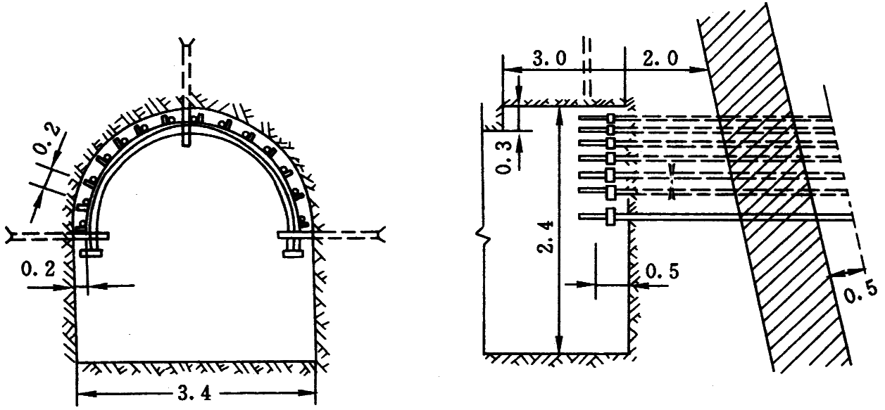 1—安装Φ25、长5.0m的锚杆(墙部);2—拱顶壁后注浆;3—安装拱部锚杆;4—开帮凿毛;