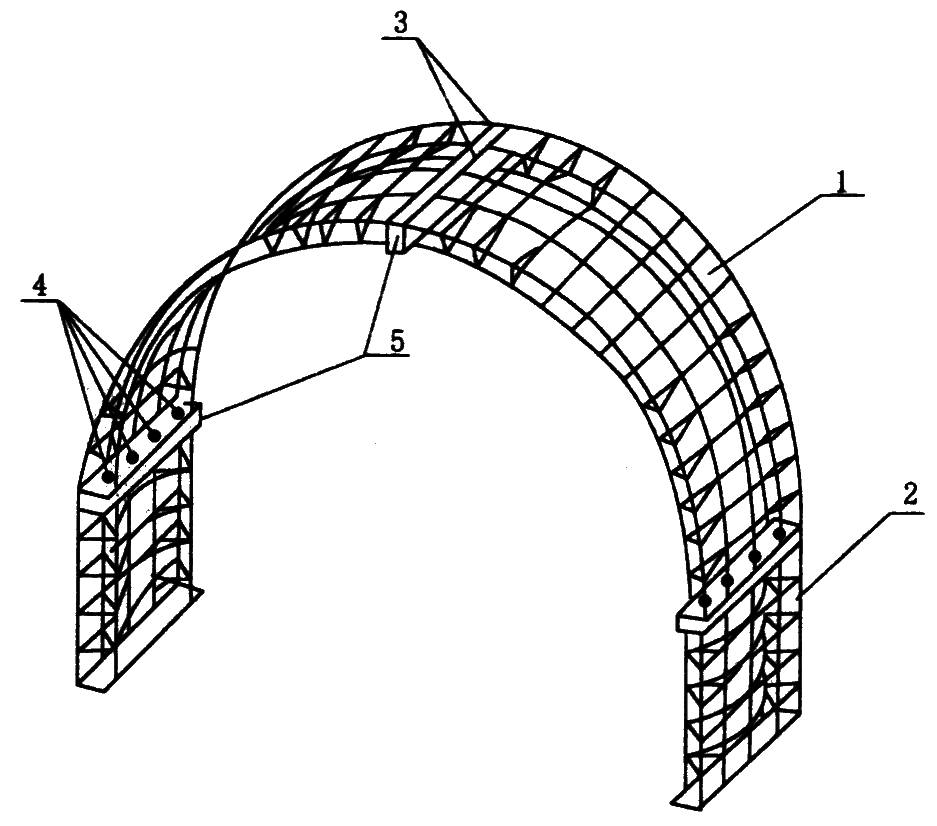 1—弧板型网壳构件;2—平板型网壳构件;3—连接板;4—螺栓;5—木垫板