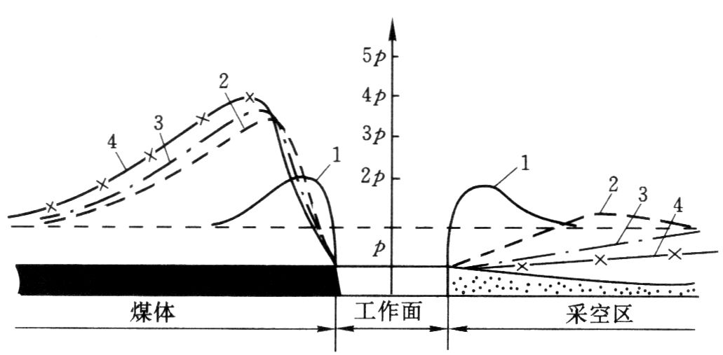 1—工作面前方煤体超前支承压力;2, 3—工作面倾斜方向煤体支承压力;