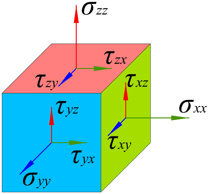 $$ \boldsymbol{\sigma }=\left[ \begin{matrix} \sigma _{11}& \sigma _{12}& \sigma _{13}\\ \sigma _{21}& \sigma _{22}& \sigma _{23}\\ \sigma _{31}& \sigma _{32}& \sigma _{33}\\ \end{matrix} \right] \equiv \left[ \begin{matrix} \sigma _{xx}& \sigma _{xy}& \sigma _{xz}\\ \sigma _{yx}& \sigma _{yy}& \sigma _{yz}\\ \sigma _{zx}& \sigma _{zy}& \sigma _{zz}\\ \end{matrix} \right] \equiv \left[ \begin{matrix} \sigma _x& \tau _{xy}& \tau _{xz}\\ \tau _{yx}& \sigma _y& \tau _{yz}\\ \tau _{zx}& \tau _{zy}& \sigma _z\\ \end{matrix} \right] $$