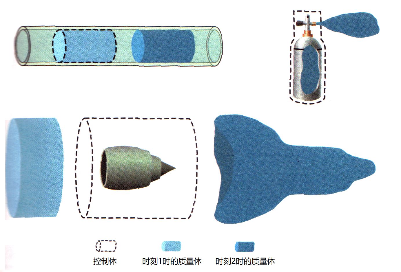 对于一维等界面管道流动,质量体通过控制体后并不改变形状。对于空气从压力罐内喷出的流动,当打开阀门时,质量体仍将完全占据控制体,但有一部分质量体的流体喷出后体积增加了。对于空气经过喷气发动机的流动,流体受到复杂的作用力,经过控制体后的质量体的体积和形状都发生了显著的改变。