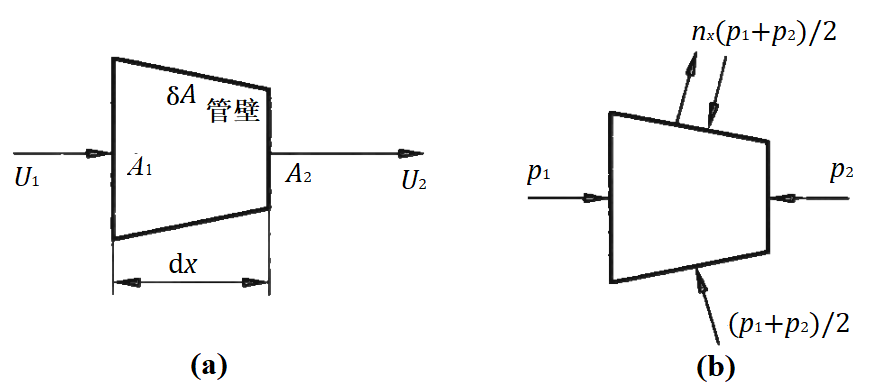 控制体上压强合力等于 $p_1A_1-p_2A_2-\left( p_1+p_2 \right) \delta A_{管壁}n_x/2$,$n_x$ 是管壁的单位法向量在 $x$ 方向的投影,由模型图可知 $\delta A_{管壁}n_x=\left( A_1-A_2 \right) =-\mathrm{d}A$,令 $p=\left( p_1+p_2 \right) /2$,因此 $\left( p_1+p_2 \right) \delta A_{管壁}n_x/2=p\mathrm{d}A$ + 高阶小量。从而控制体上压强的合力为