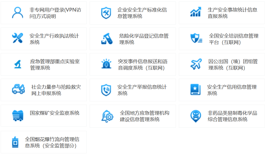 2020 年底,我国已基本建成“安全生产信息系统”,其中包含“六大体系”(安全生产信息网络、基础环境、大数据、应用服务、安全与运维、标准规范),实现全国安全生产信息化“一张网、一张图、一张表、一盘棋”的基本格局。