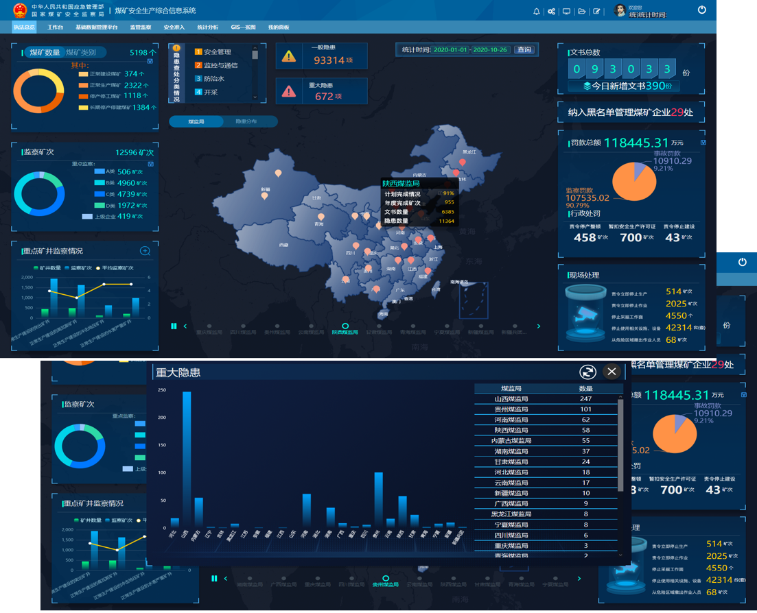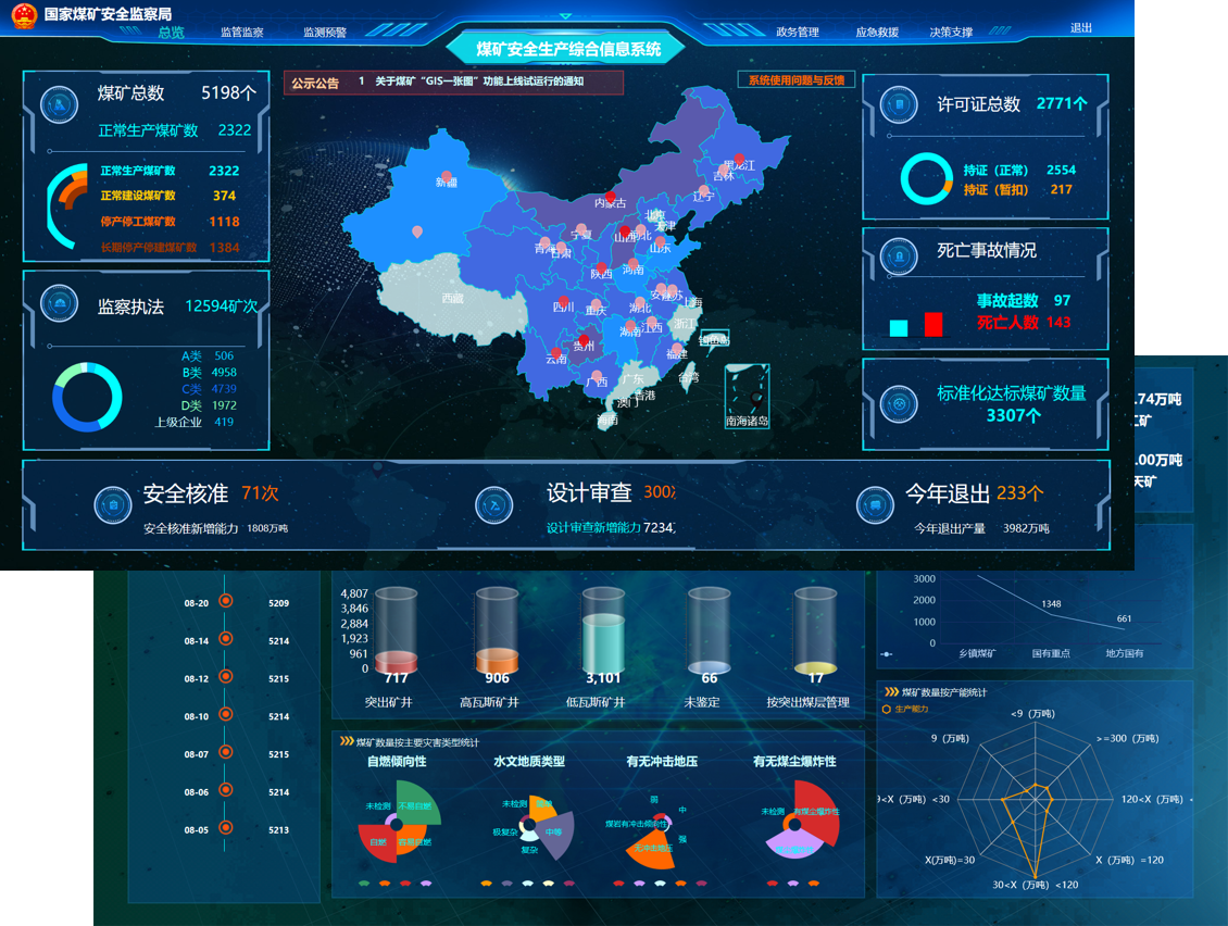 系统依托国家煤矿安全监察局的基础设施,在省级煤矿安全监管监察部门部署数据采集系统,将煤矿监测监控数据上传至国家煤监局,国家煤矿安全监察局根据业务需要,开发重大风险预警、综合风险分析、事故应急支持及风险动态研判等应用系统。