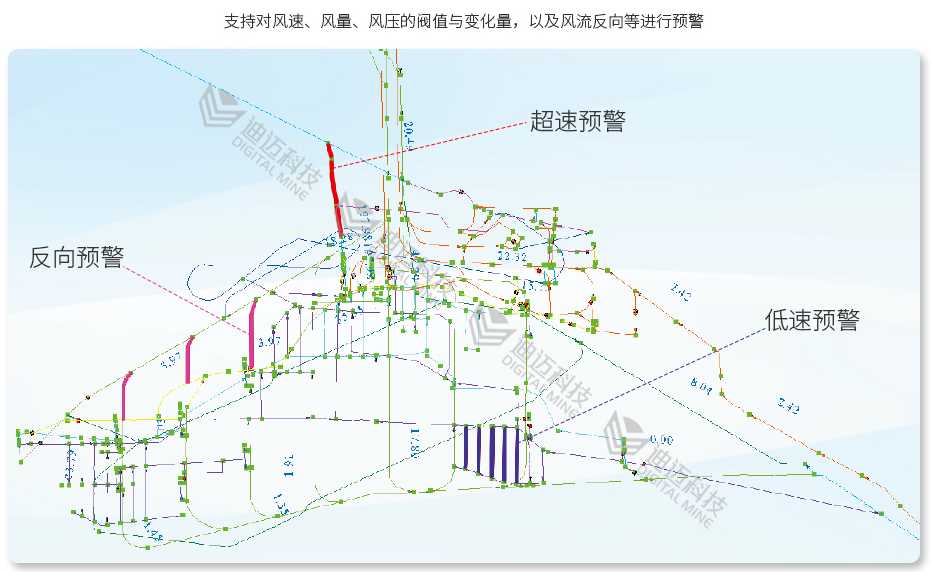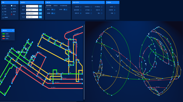 目前国内外对矿井通风智能化相关理论和技术的研究已经非常深入,市场上具有较多的矿井智能通风软件,这些软件大都实现了风机与气候环境在线监测、通风网络解算、通风系统设备设施远程调控的功能,部分还具有通风隐患自动监测识别、通风系统优化方法自动生成、应急预案制定及避灾路线自动分析等智能化功能。
