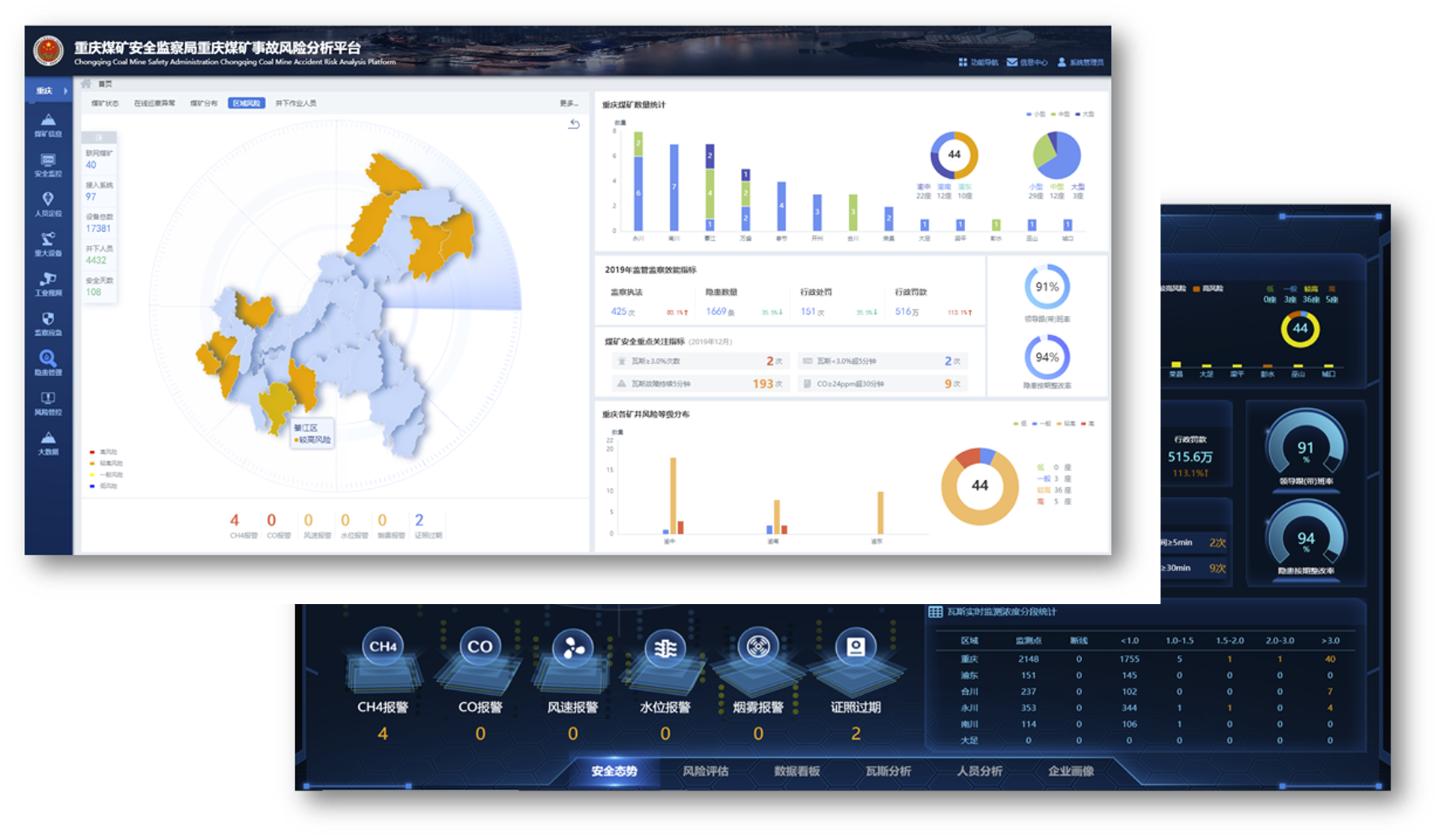 如重庆市建立的“重庆煤矿安全监察局重庆煤矿事故风险分析平台”实现了安全量化指标体系、诊断模型及专家知识库,接入企业各类在线、非在线系统,对视频监控系统与各类系统进行关联分析,识别各类违章行为;对企业安全生产海量数据进行关联碰撞及分析挖掘,实时判断企业安全生产风险等级;融合多源数据,通过逐层逐级关联碰撞分析,评估区域安全生产风险等级与演化趋势。