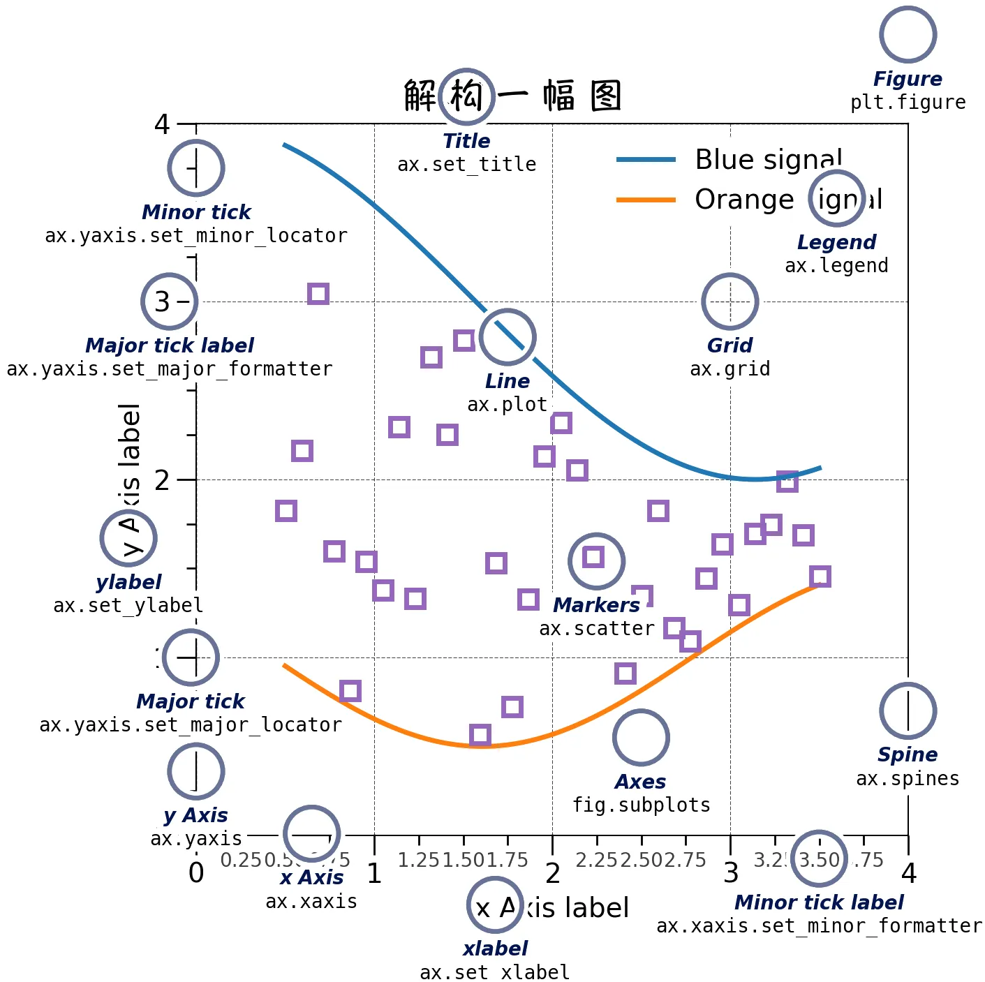 Figure 的组成Axis这些对象设置刻度及其值的范围,并生成刻度线和刻度标签。刻度线的位置由一个 Locator 对象决定,刻度标签字符串通过一个 Formatter 进行格式化。可以通过 Locator 和 Formatter 组合对刻度进行细微的调节。