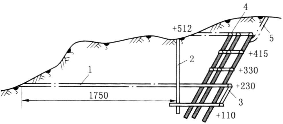 1-主平硐;2-副斜井;3-阶段运输大巷;4-阶段辅巷