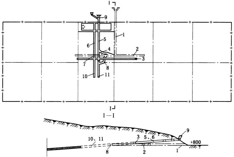 8-下山上部车场;9-风井;10-运输下山;11-轨道下山