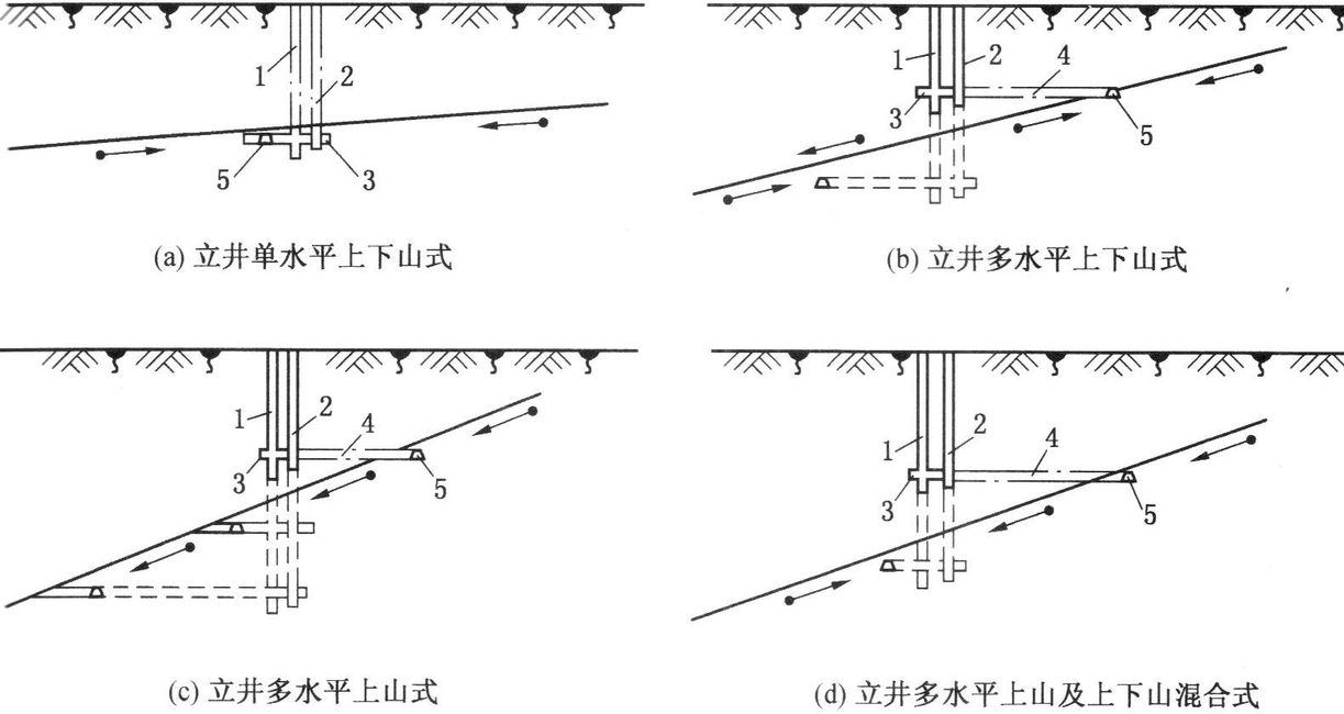 - 立井多水平上山及上下山混合开拓;