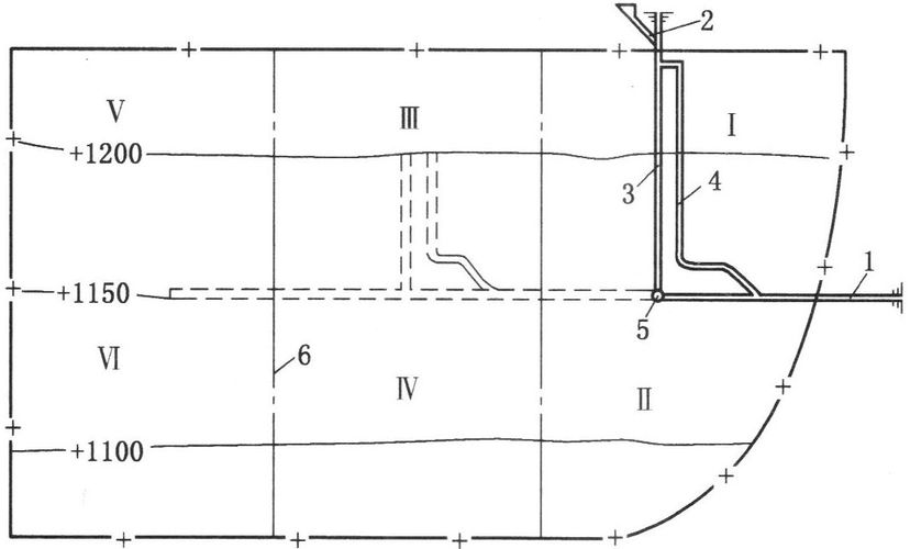 4-阶段运输巷;5-阶段回风巷;6-采煤工作面