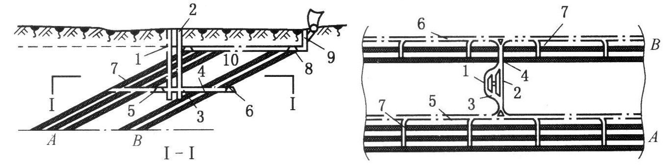 1-主井;2-副井;3-主要石门;4-分层运输大巷;