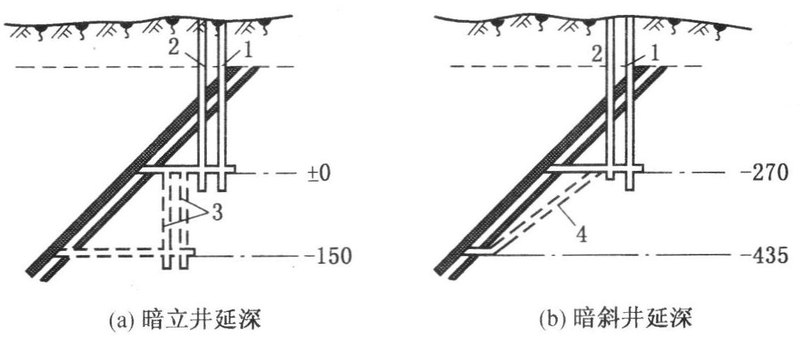 - 优点: 生产与延深互不干扰; 延深施工容易; 暗井位置、方向、倾角、提升方式不受原有井筒限制; 原有井筒提升能力不变,设备可继续使用。