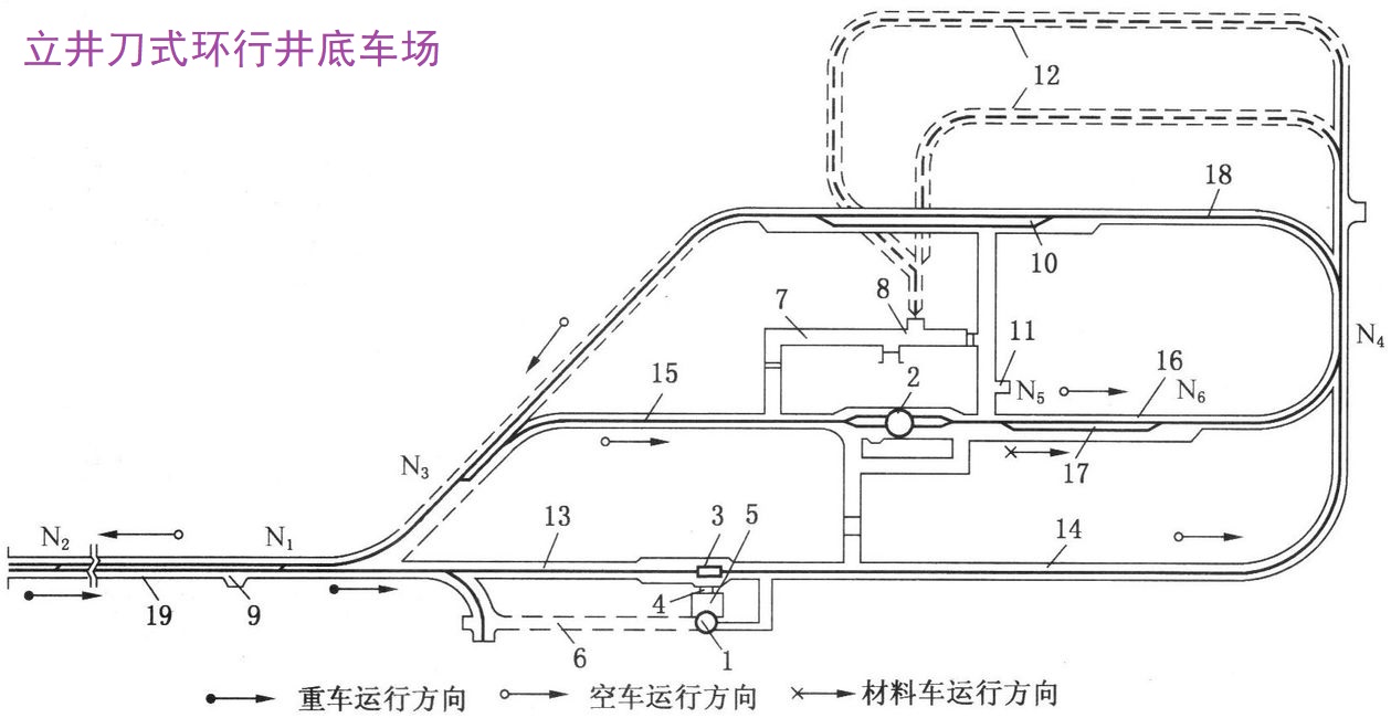16-副井空车线;17-材料车线;18-绕道回车线;19-调车线;N1~N6-道岔编号