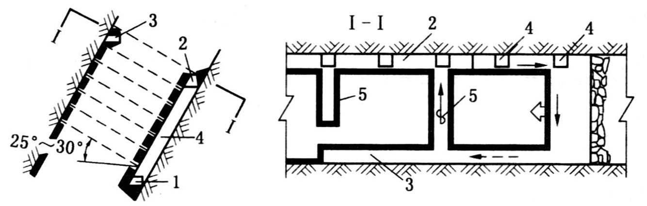 - 工作面落下的煤,自溜至区段运输平巷6,再运至采区溜煤眼3,在石门装车外运。新鲜风流从采区石门进入,经行人眼区段运输平巷6,到采煤工作面。废风从工作面经区段回风巷7到采区石门2排出。