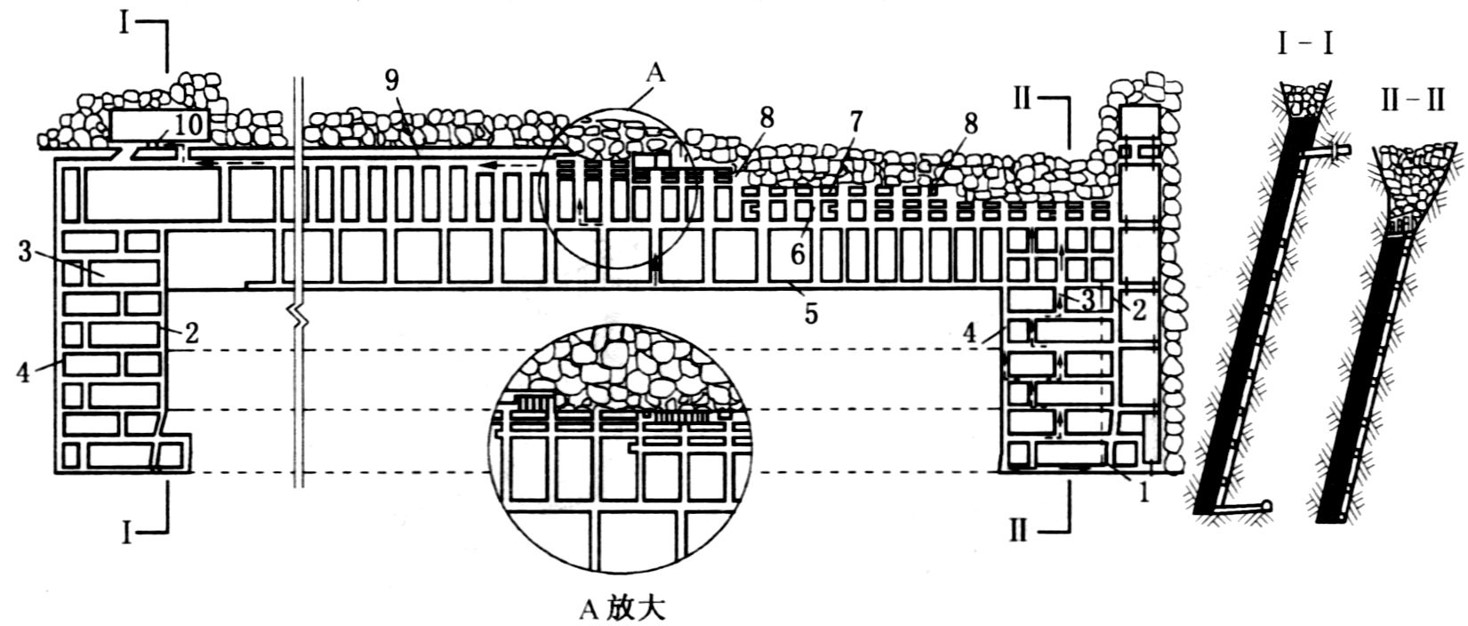 1-回风石门;2-运输石门;3-工作面回风巷;4-工作面运输巷;5-伪斜小巷;6-竹笆;7-胶带挡煤板;8-支柱;9-放煤插板;10-溜槽