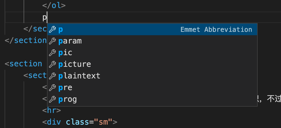 是否觉得 VSCode 中各式的 HTML 的元素很难输入?尤其是各种 <>/ 符号,其实并不难,因为 VSCode 中已自带了 Emmet 扩展,你只要输入元素名称,如 pulli,然后按 Table 键就能快速输入元素了。其实还有更多很高级的输入功能,自己去 Emmet 官网查看吧。