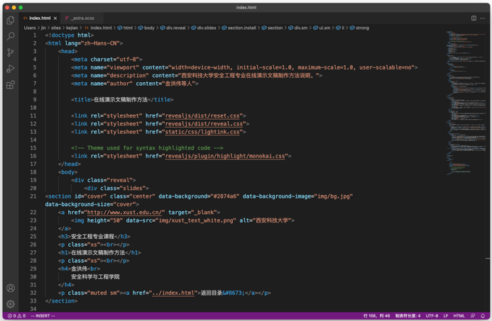 ❷ 现在已经可以新建幻灯片了。往下翻翻 index.html 文件,你将会发现一些 <section>...</section> 元素,全部处于 <div class="slides">...<div> 元素的内部。每个 section 元素对应一页幻灯片。接下来你可以选择两种行动来填充你的文稿: