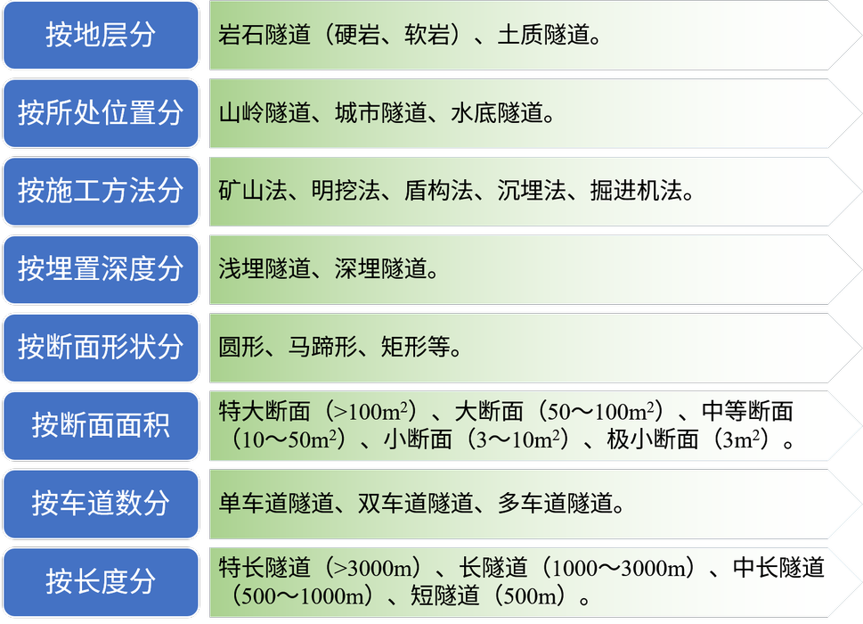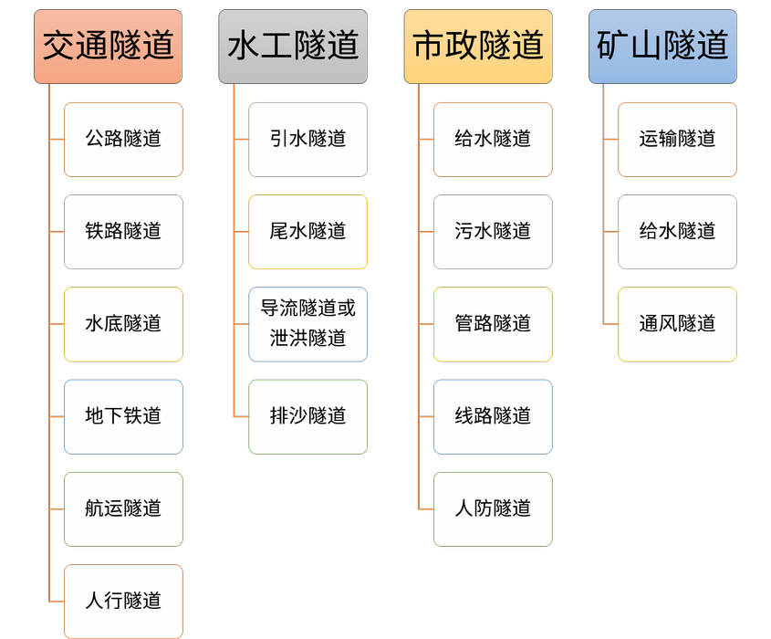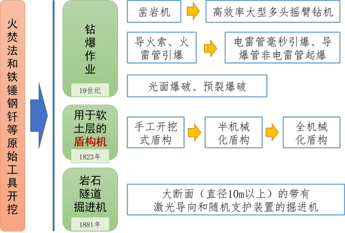 - 近代和现代(从17世纪以后的产业革命开始):随着动力机械和炸药的发明和应用,隧道技术得到极大的发展,应用范围迅速扩大。