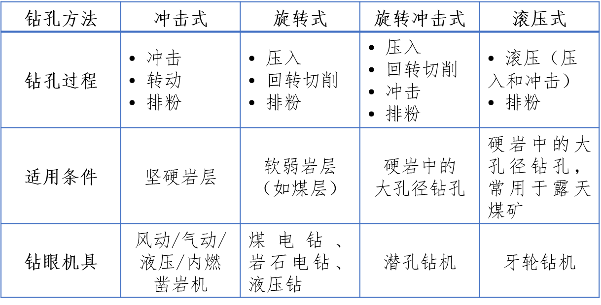 井巷掘进中,在岩石中钻眼,主要采用冲击式钻眼法,使用的钻眼机械是凿岩机;在煤层中钻眼,主要采用旋转式钻眼法,多使用煤电钻。