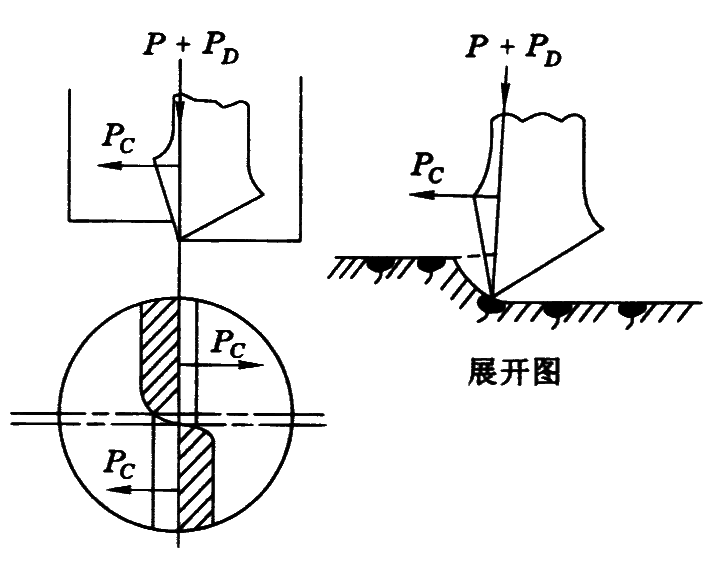 切割型钻头在轴压力P的作用下,克服岩石的抗压强度并侵入岩石一定深度 h;同时钻头在回转力 Pc 的作用下,克服岩石的抗切削强度,将岩石一层层切割下来,钻孔运行的轨迹是沿螺旋线下降,岩屑被排出孔外。
