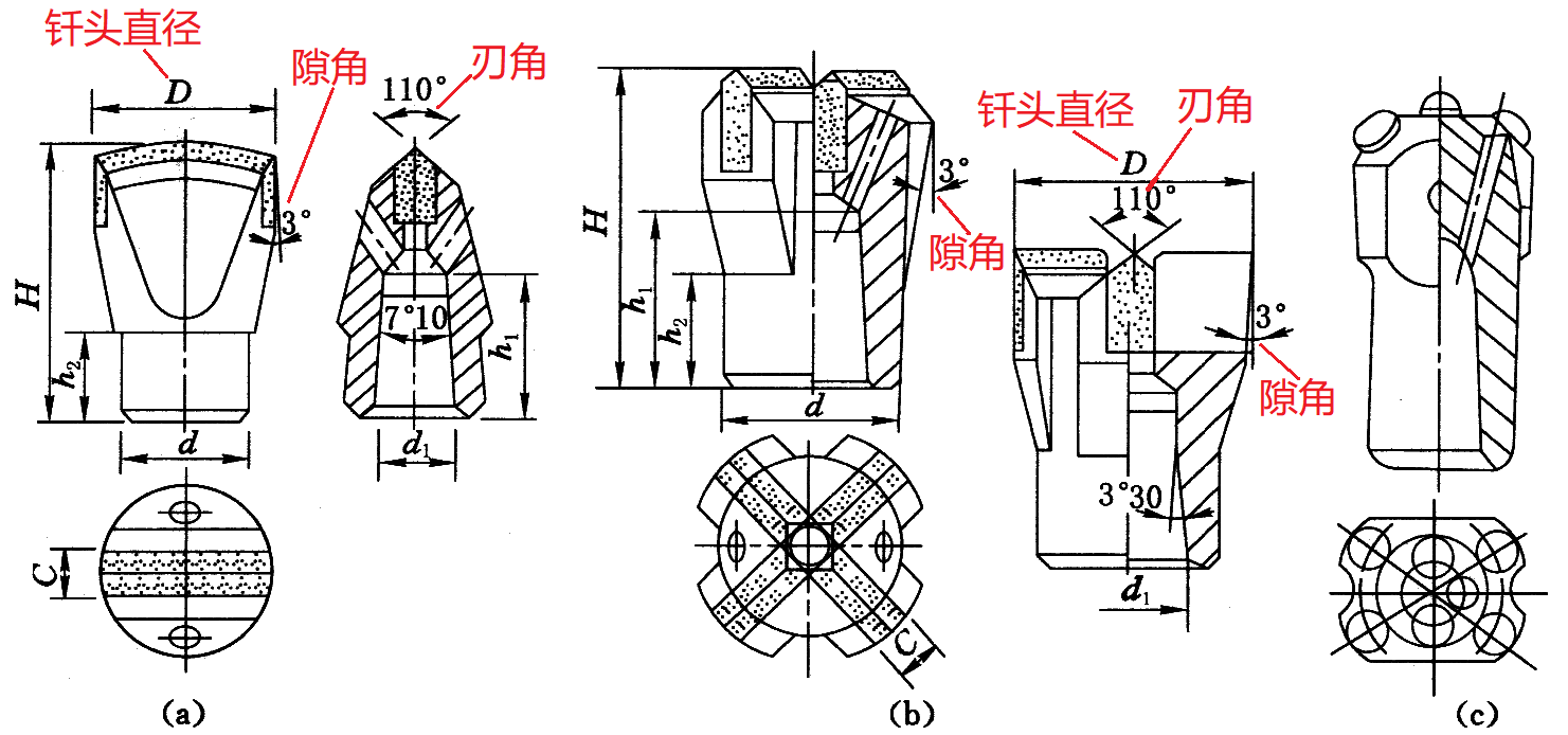 (a) 一字形钎头;(b) 十字形钎头;(c) 球齿钎头