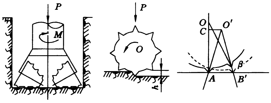 以牙轮钻头的滚压作用破碎孔底岩石。凿岩过程中,钻机通过钻杆给牙轮钻头施以轴压 P,同时钻杆在回转力矩 M 作用下旋转带动牙轮钻头绕钻杆做公转运动,而牙轮又绕自身轴做自转,即在岩石上形成滚动。滚动过程中,压力以一个齿→两个齿→一个齿交替地滚压岩石,使牙轮的轴心上下震动,从而引起钻杆周期性地弹性伸缩,钻杆的弹性能不断作用于牙轮,并通过滚轮牙齿传递给岩石,因此作用处岩石破碎,同时钻杆震动引起的冲击又加强滚轮牙齿对岩石的破碎。岩屑在钻头喷出的压缩气体作用下排出孔外。