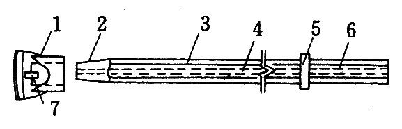 1—钎头;2—锥形梢头;3—钎杆;4—中心孔;5—钎肩;6—钎尾;7—钎头孔