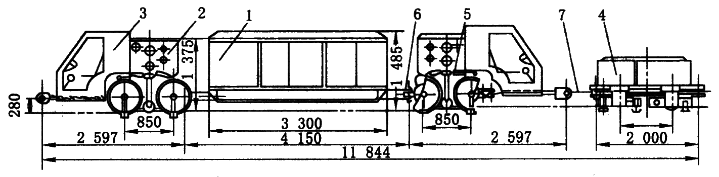 1—动力部;2—传动部;3—驾驶室;4—制动车;5—胶轮调整机构;6—连接器;7—拉杆
